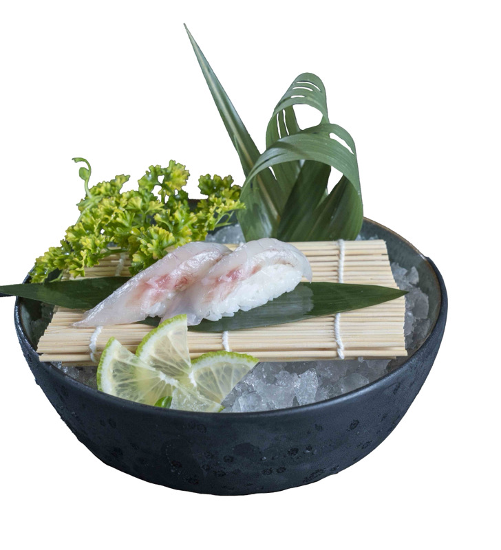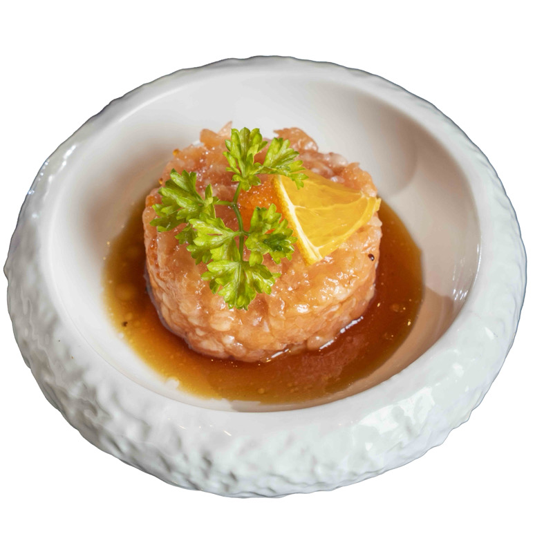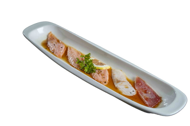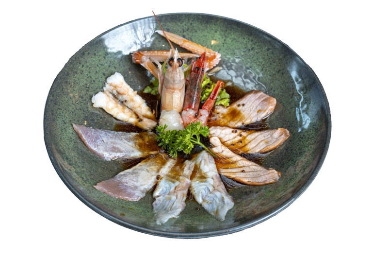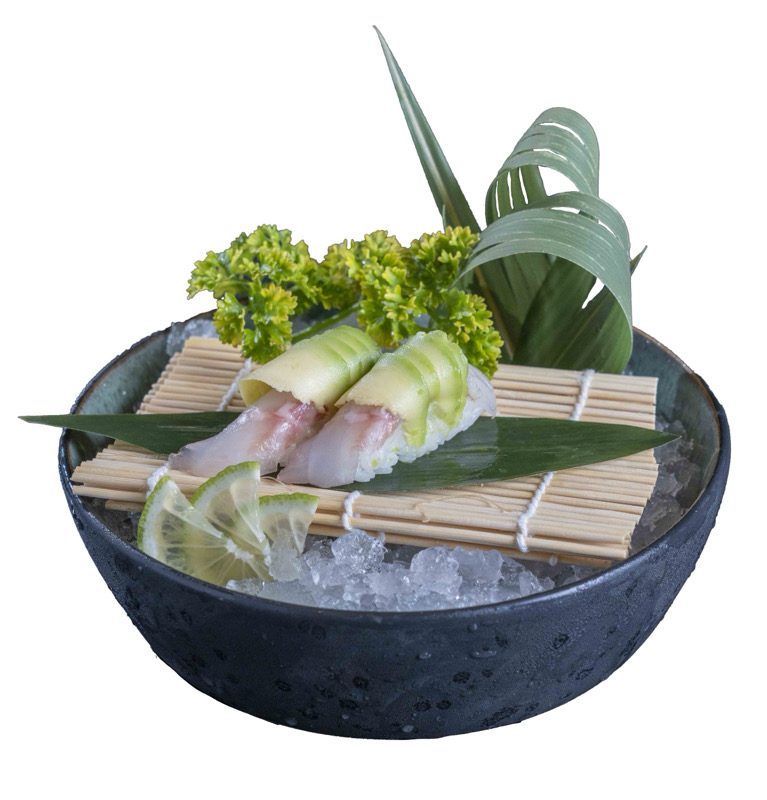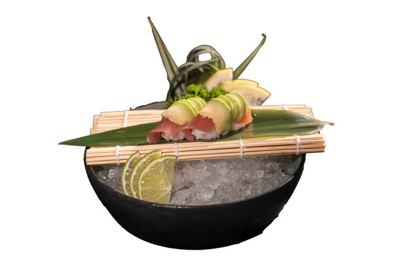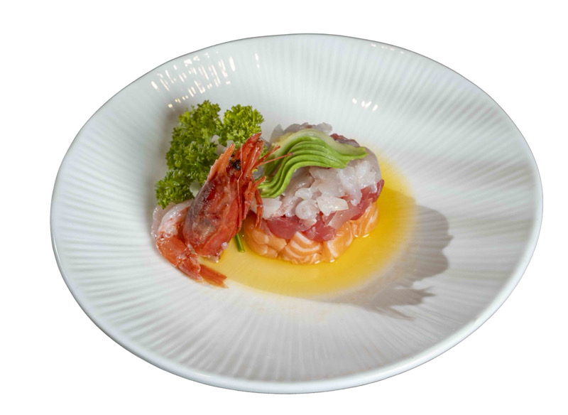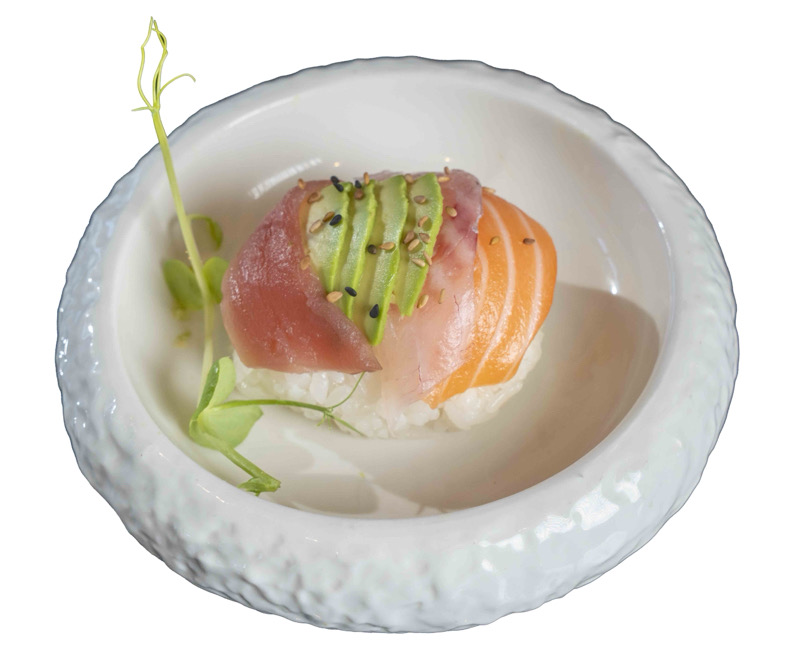tartare di salmone,branzino,tonno con gambero rosso Mazara del vallo e avocado,condito con salsa yuzuNIGIRI