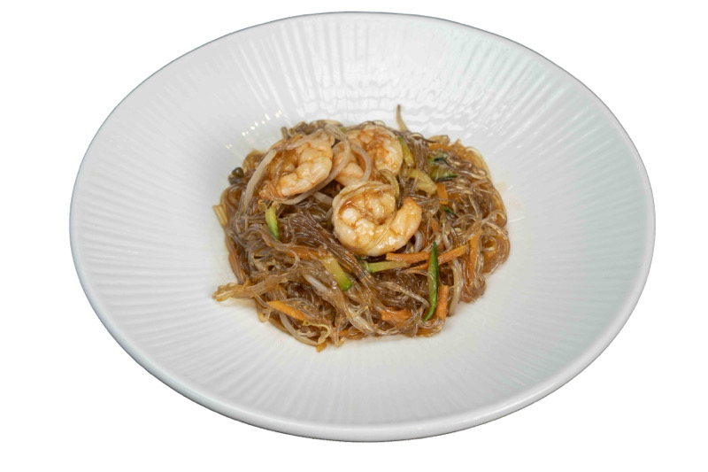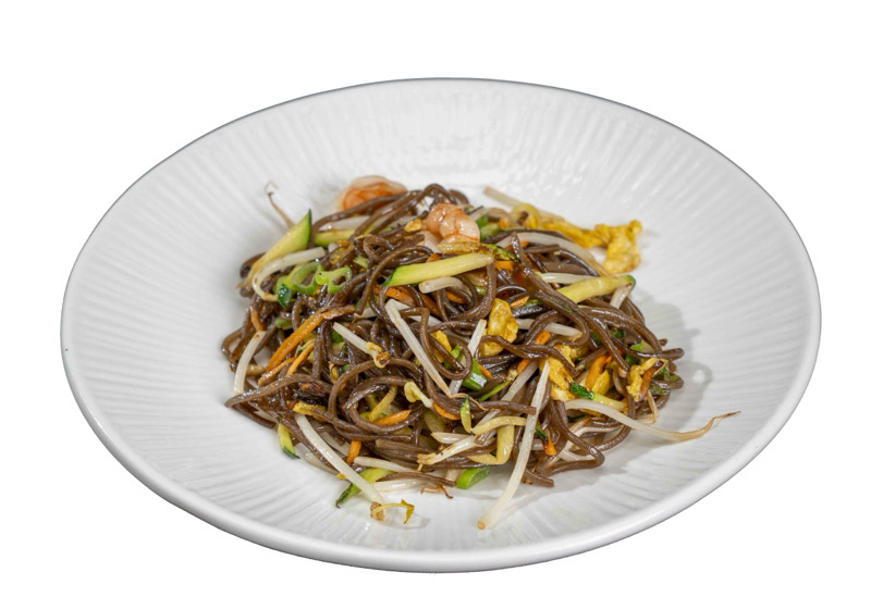 Pasta di grano saraceno saltata con salsa di soia,gamberi,uova e verdure miste