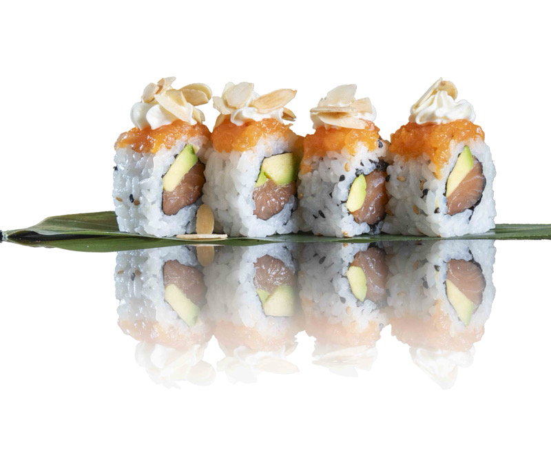 8 pz roll di riso con salmone e avocado,coperto di salmone spicy,philadephia,mandorle e sesamo