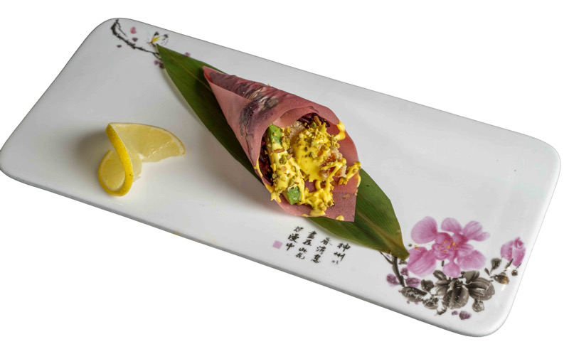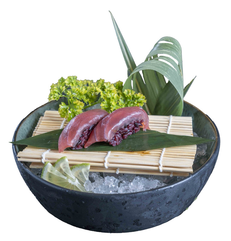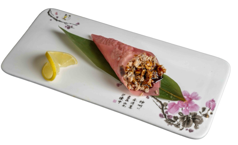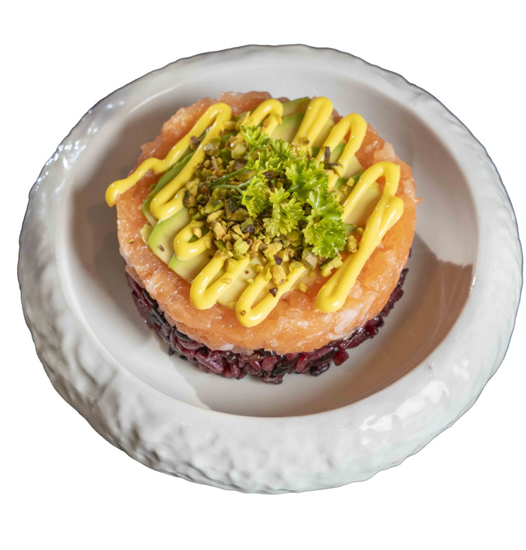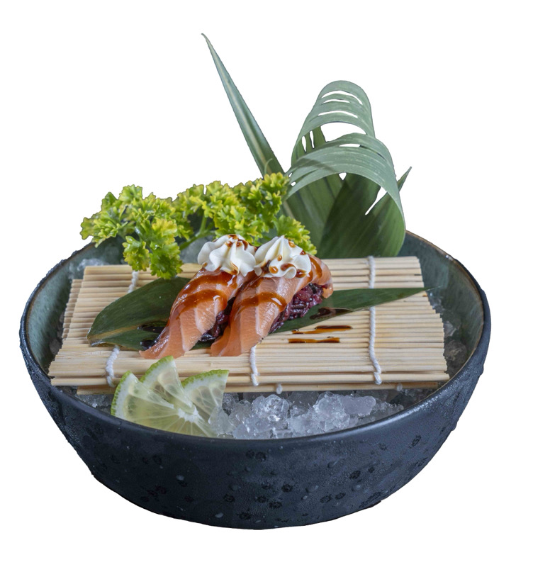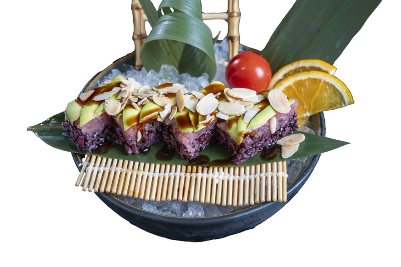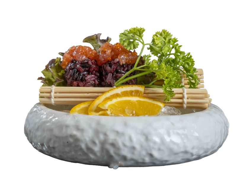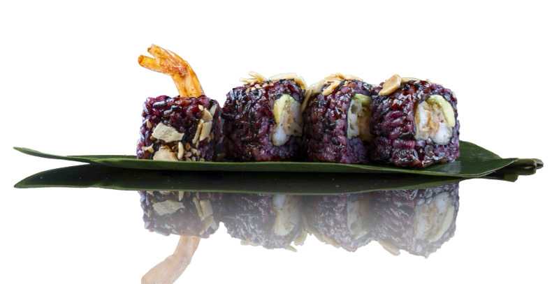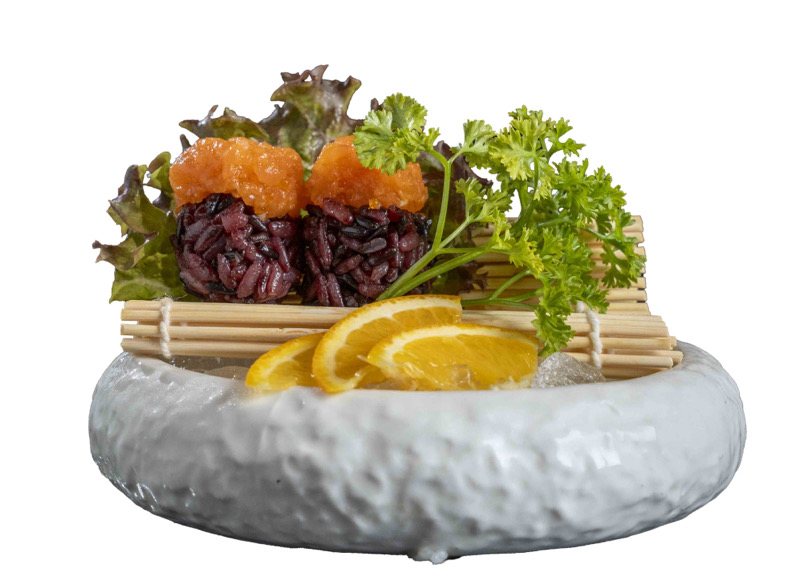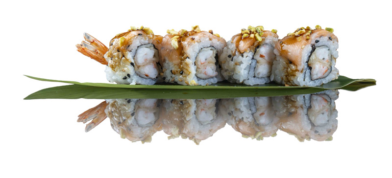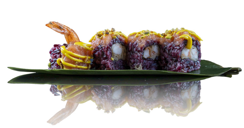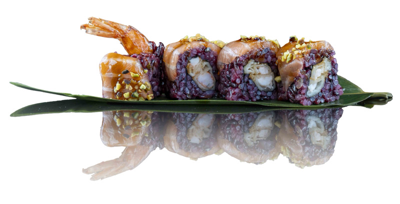 8 pz roll di riso venere con gambero fritto,coperto da tartare di salmone,salsa zafferano e pistacchi