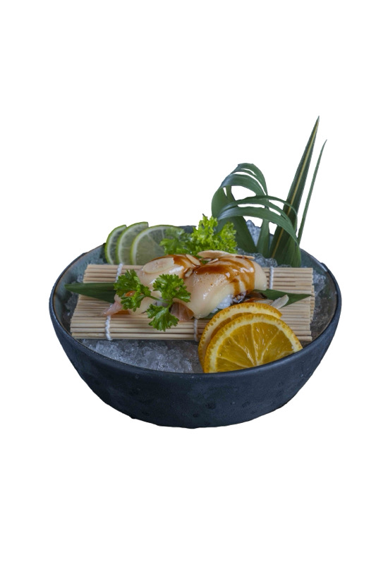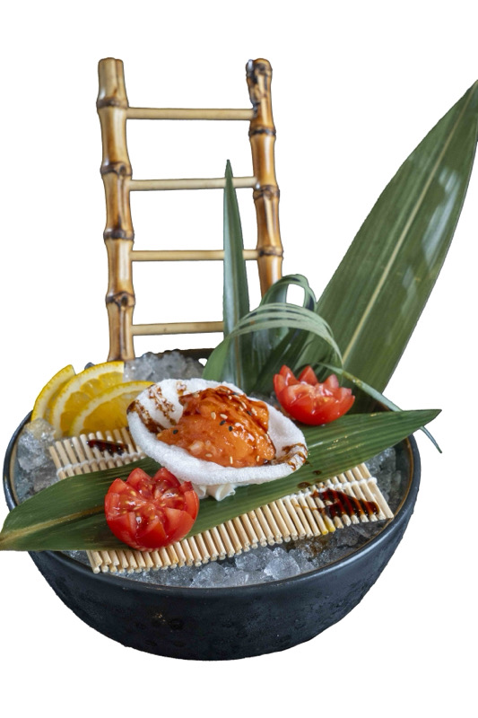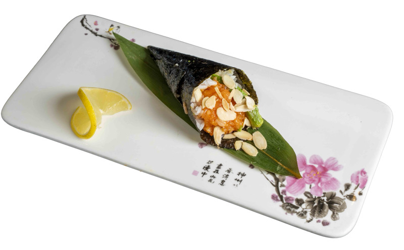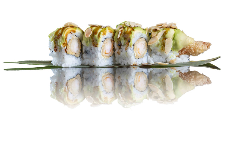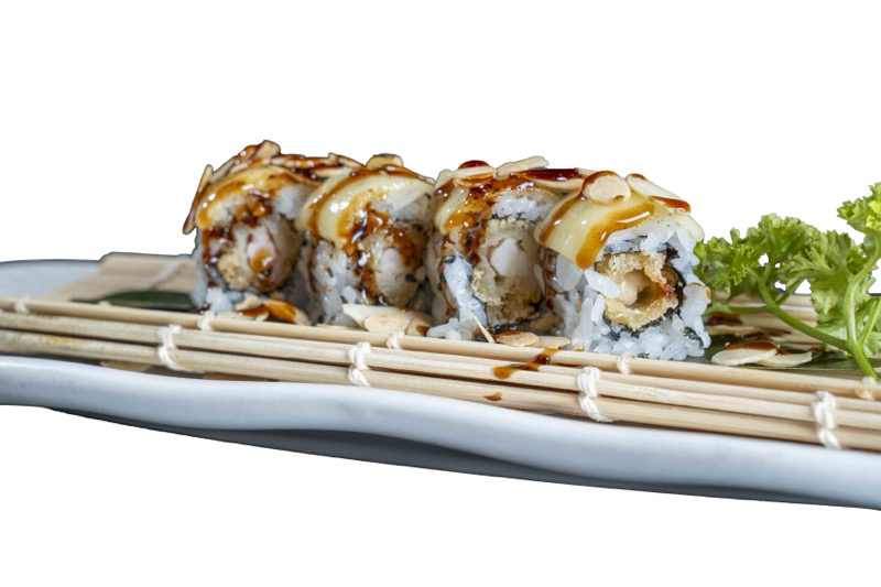 8pz roll di riso con gamberi fritti,coperto di pesce misto,avocado,mandorle,salsa teriyaki e sesamo