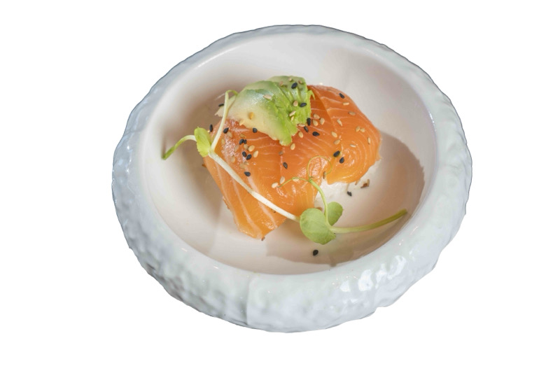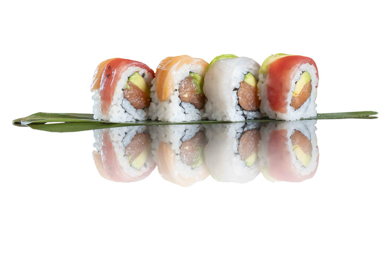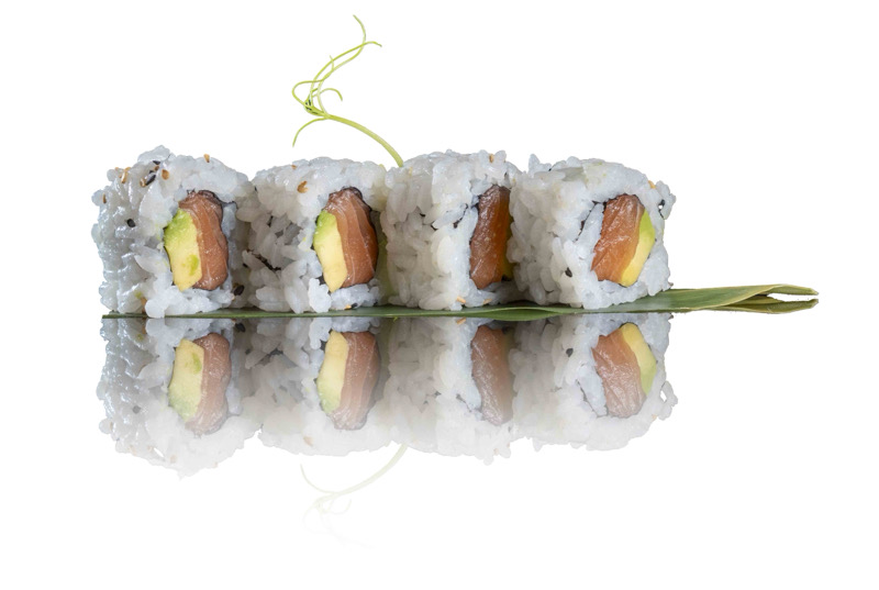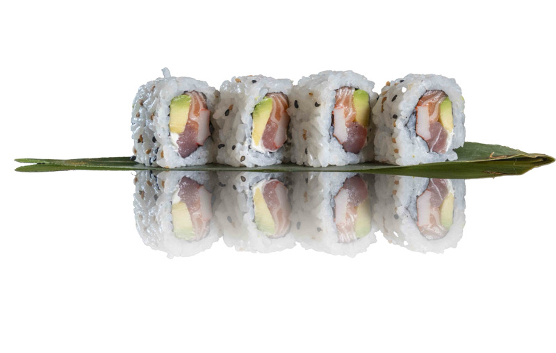 8pz roll di riso con salmone e avocado,coperto di fette di pesce misto, avocado e sesamo