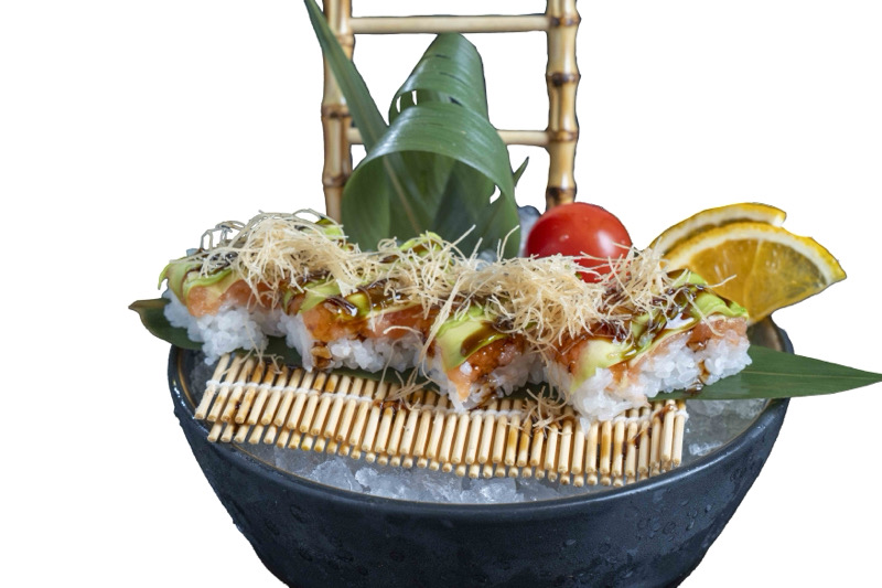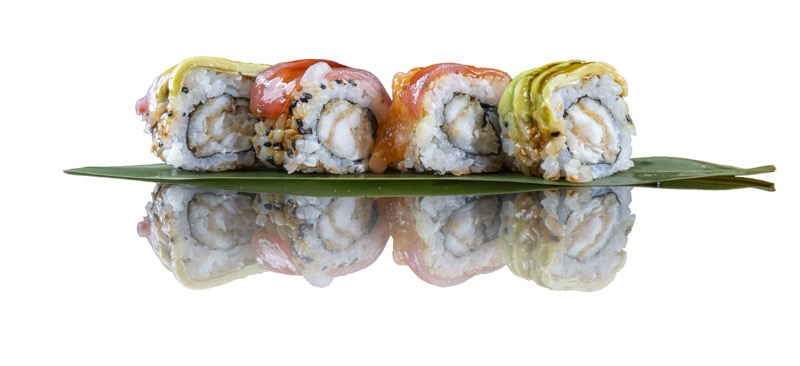 8 pz roll di riso con branzino fritto,coperto di pesce misto,avocado,salsa teriyaki e sesamo