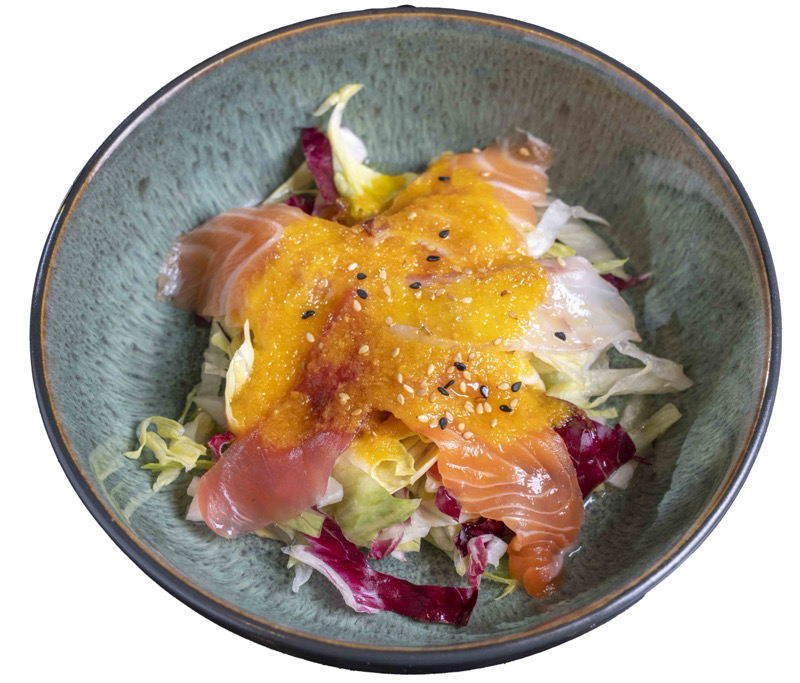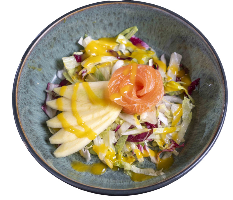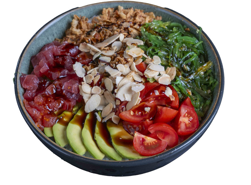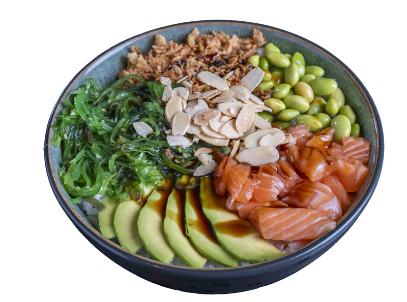 riso,salmone,avocado,edamame,pomodorini,wakameverde,mandorle cipolla croccante e salsa poké