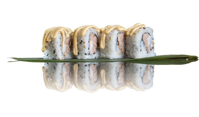 8 pz roll di riso con tonno cotto,gamberi cotti,coperto di maionese spicy e sesamo