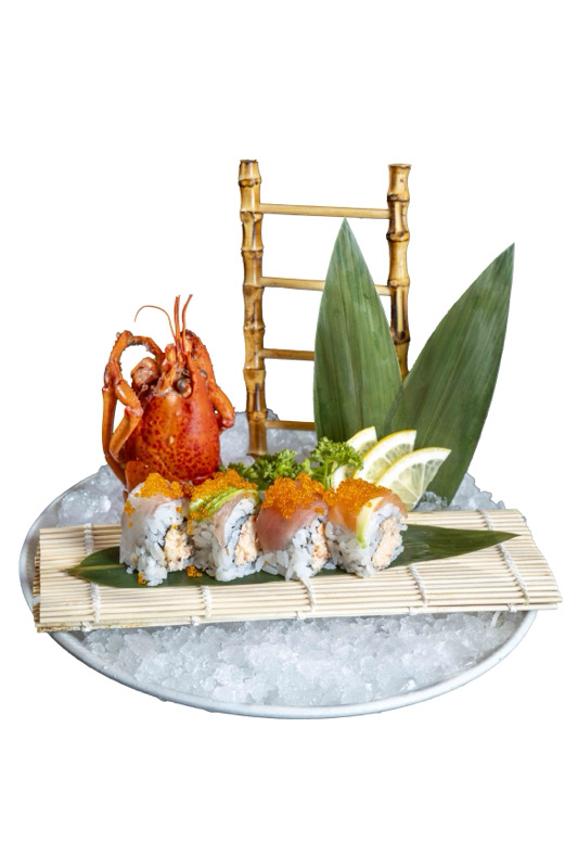 8pz roll di riso con surimi,astice e salsa rosa,coperto di pesce mix,avocado e tobiko
