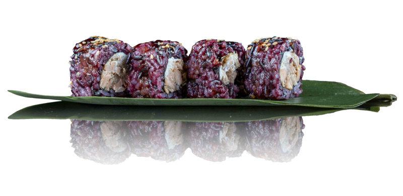 8 pz roll di riso venere con salmone spicy grigliato e philadephia,coperto di salsa teriyaki e sesamo