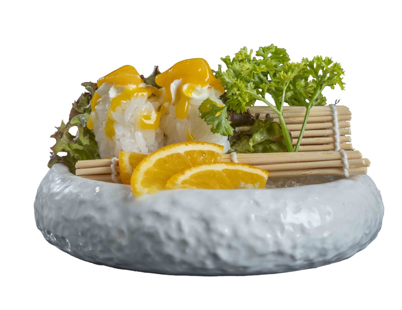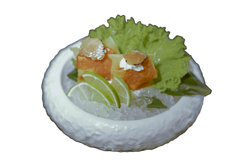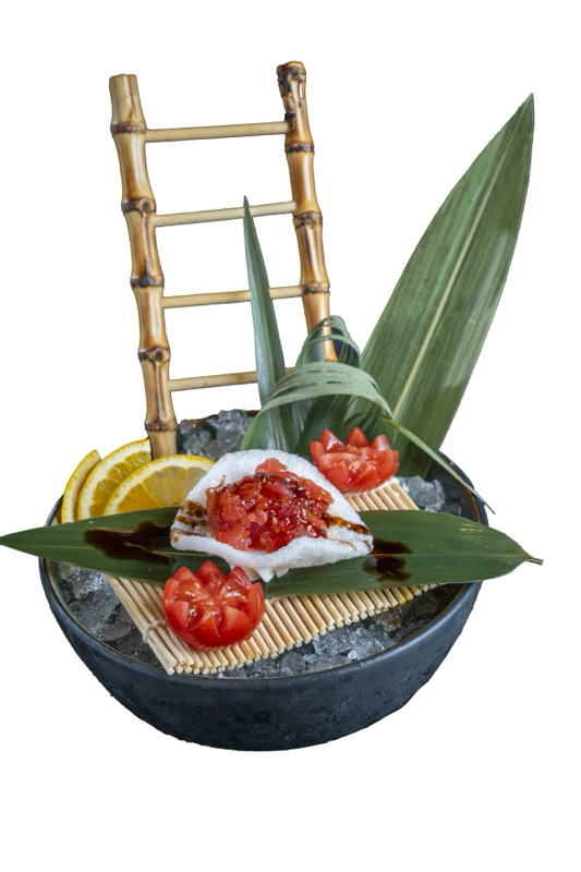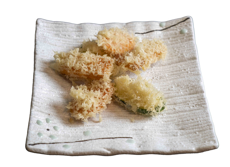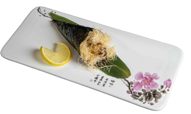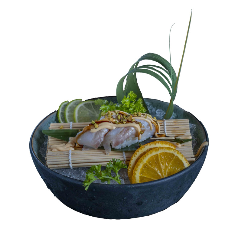 8 pz roll di riso venere con salmone fritto e philadephia,coperto di branzino,kataifi,salsa allo zafferano e sesamo