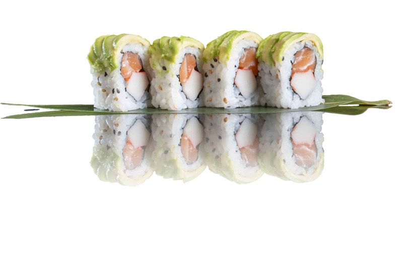 roll di riso con surimi e avocado,coperto di salmone affumicato,avocado e sesamo