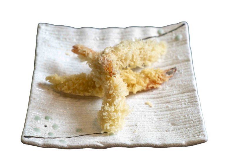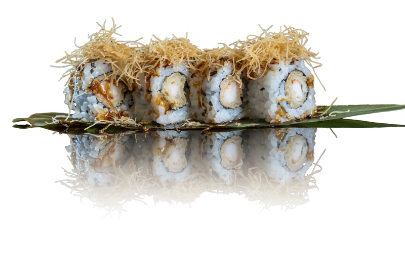 8 pz roll di riso con gamberi fritti,coperto di kataifi,salsa teriyaki e sesamo