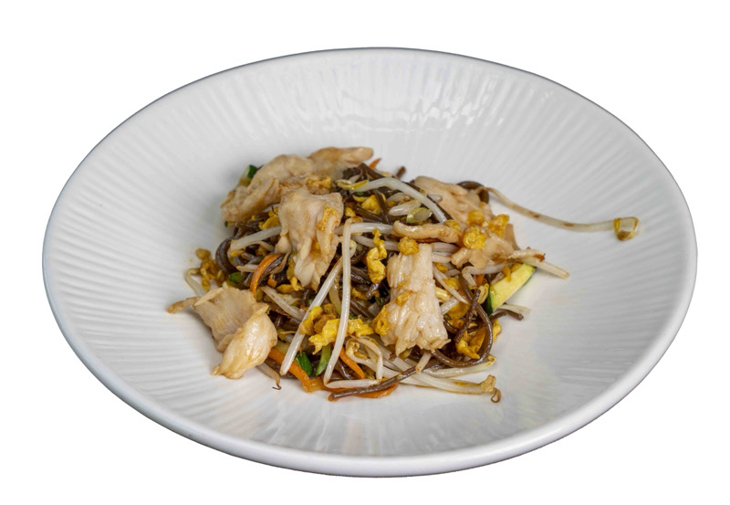 Pasta di grano saraceno saltata con salsa di soia,pollo,uova e verdure miste