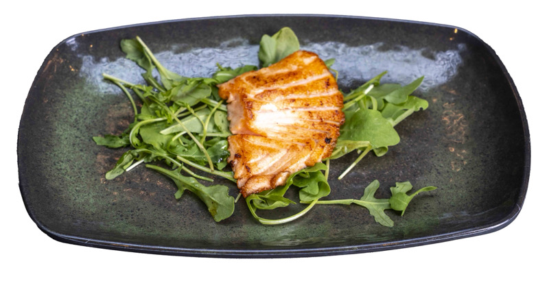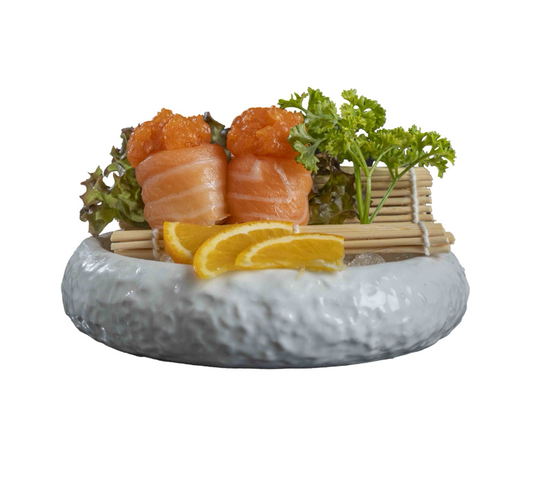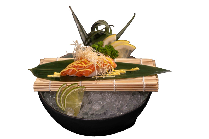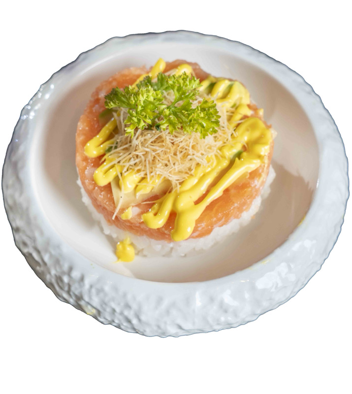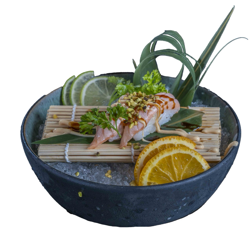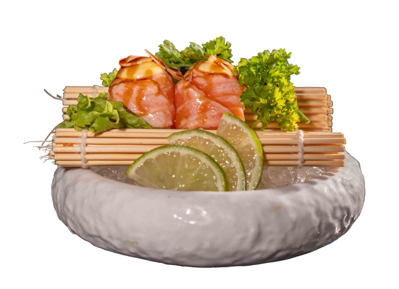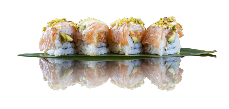 8 pz roll di riso con salmone spicy e avocado,coperto di salmone scottato,pistacchi,maionese e sesamo