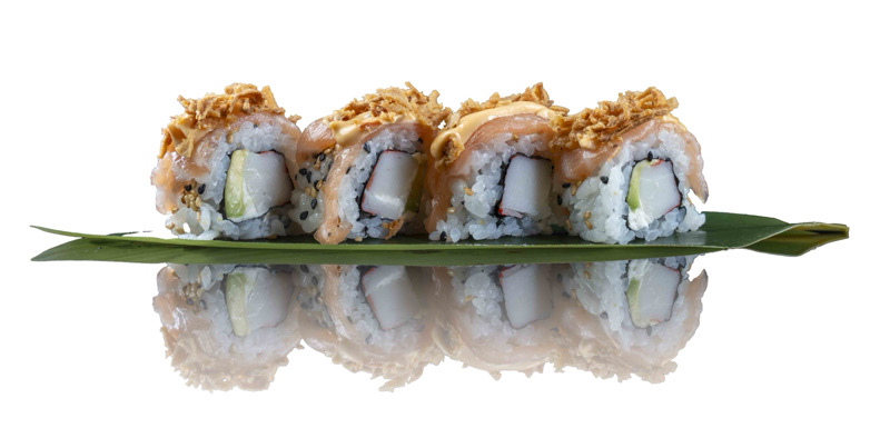 8 pz roll di riso con philadephia,avocado e surimi,coperto di salmone,maionese spicy,cipolla fritta e sesamo