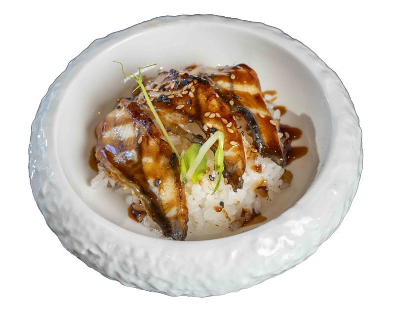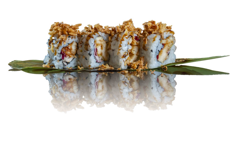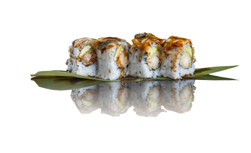 8 pz roll di riso con gamberi fritti e avocado,coperto di anguilla scottato,salsa teriyaki e sesamo