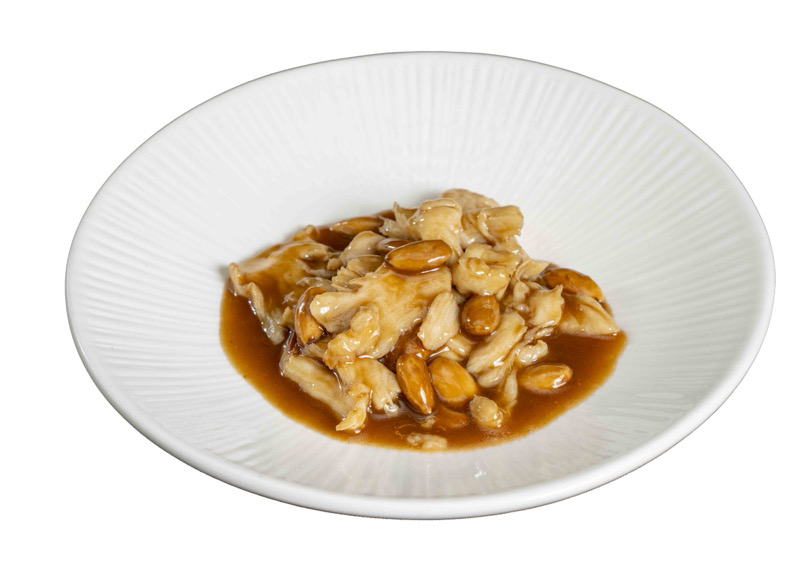 8 pz roll di riso con gamberi fritti e avocado,coperto di mandorle,salsa teriyaki e sesamo