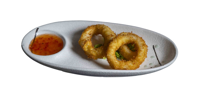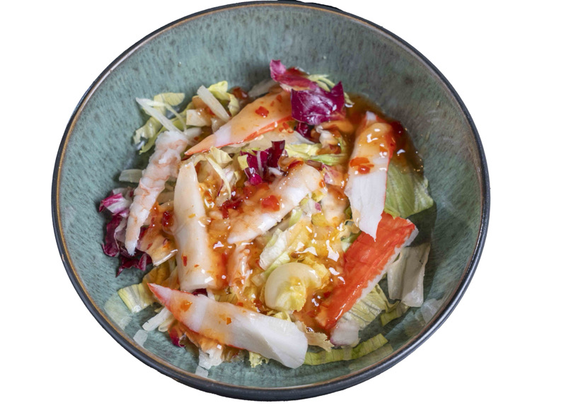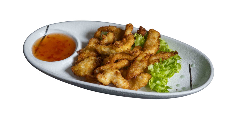8 pz roll di riso con calamari fritti e insalata,coperto di salmone,salsa agropiccante e sesamo