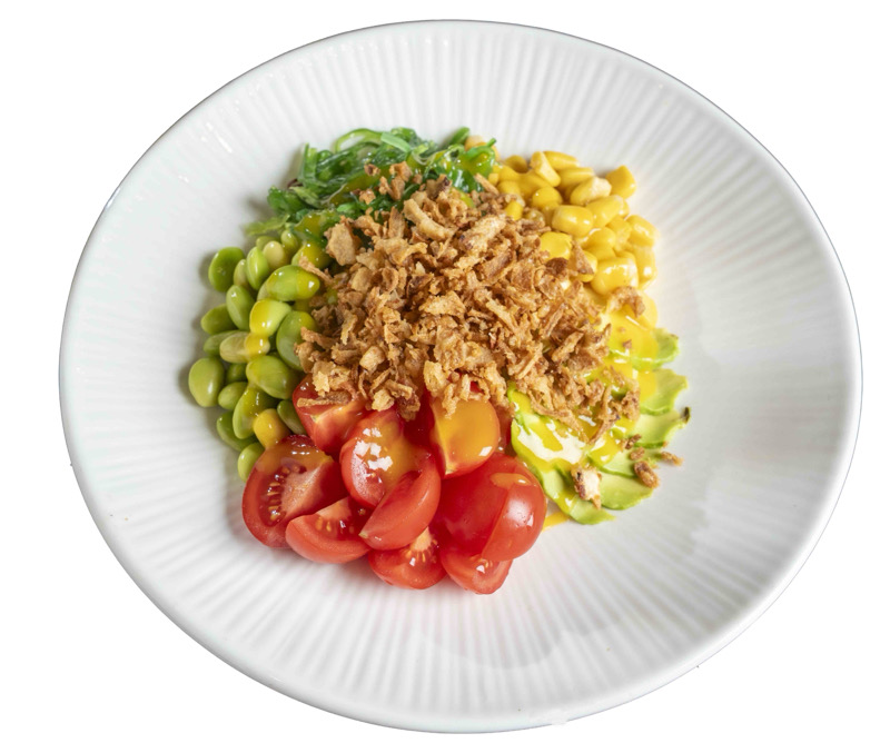 riso,avocado,wakame verde,edamame,mais,cipolla,pomodorini croccante e salsa pokéURAMAKI