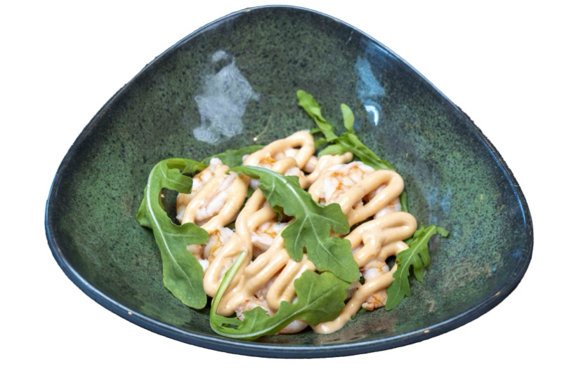 8 pz roll di riso con gamberi fritti,coperto di surimi,maionese spicy e sesamo