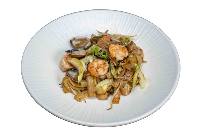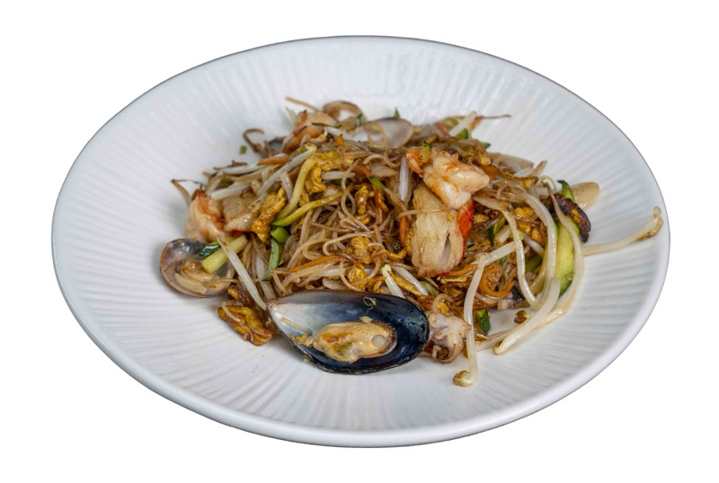 spaghetti vietnamiti saltati con salsa di soia, frutti di mare e verdure miste