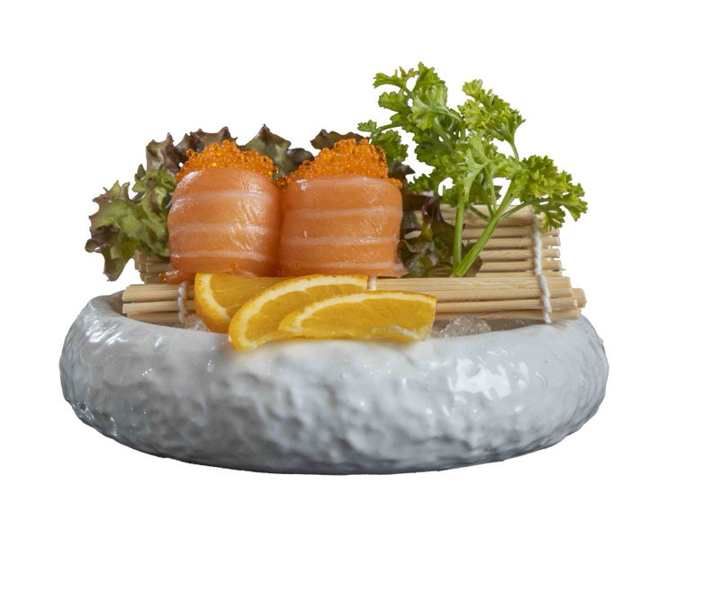 8pz roll di riso senza alga con salmone,coperto di salmone e con sopra philadephia