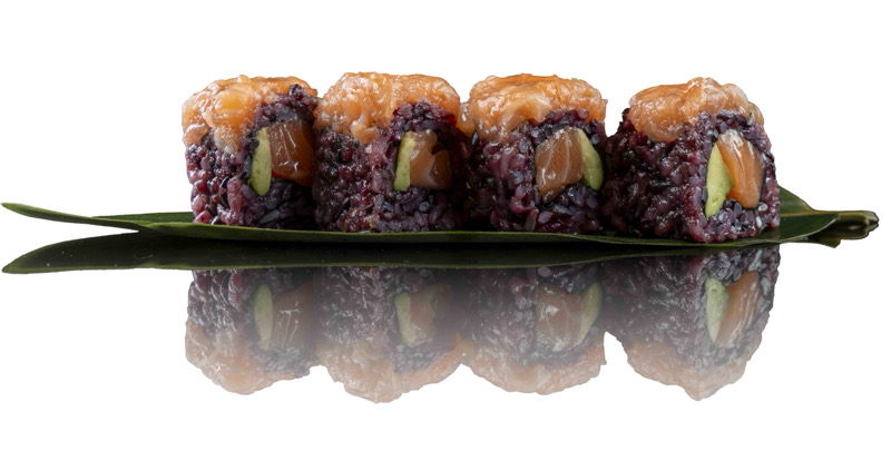 8 pz roll di riso venere con salmone e avocado,coperto di tartare di salmone e sesamo